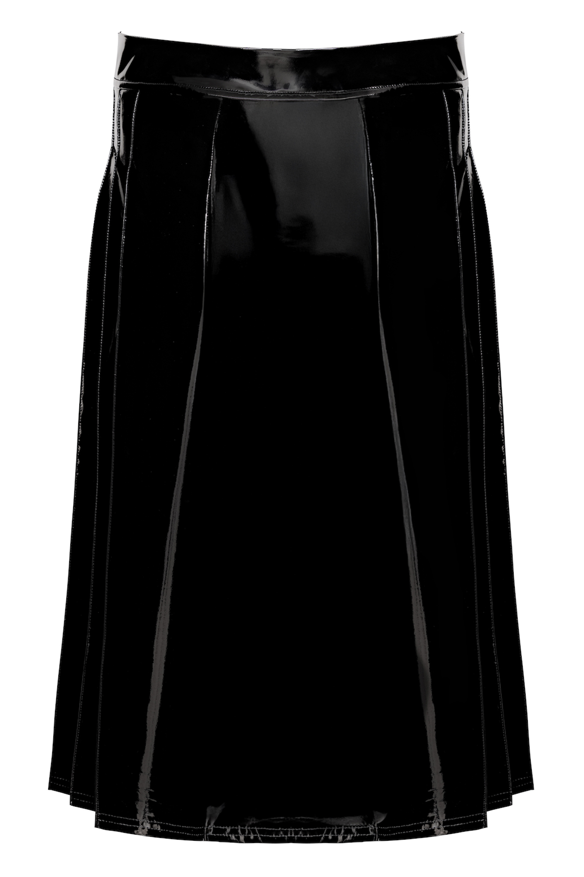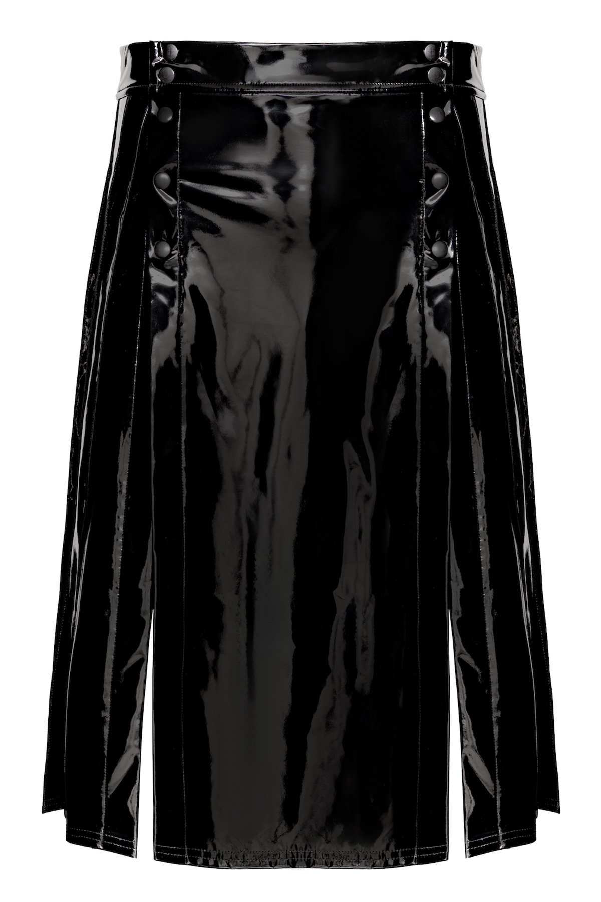 Herren Rock aus glänzendem Lack gefertigt, mit handgenähten Seitenfalten. Wadenlang mit Druckknopfverschluss vorne. Strukturierte Silhouette, fließende Bewegungen und ein markanter Glanz.