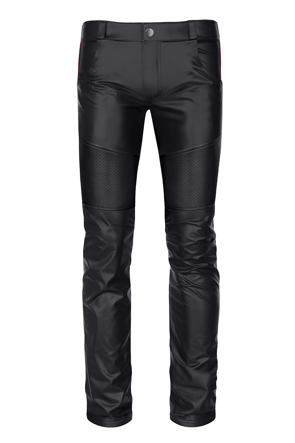 Classic low-waist trousers made of black elastic wetlook fabric. At the front, on the thighs, there are inserts of perforated material that draw attention and serve as an attractive visual detail. The trousers feature two front pockets and two back pockets, providing enough space to store a phone, wallet, car keys, or other small items. The zippers are engraved with the RFP Regnes Fetish Planet logo. The trousers are designed with belt loops, allowing you to wear them with a belt. A distinctive red Alcantara label with the RFP logo adds the perfect finishing touch - a detail sure to impress anyone who values refined and unique design elements.