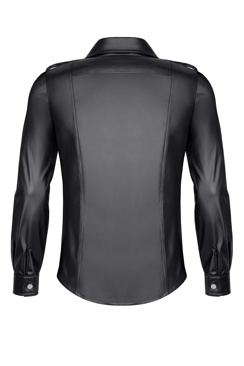 Black shirt made of elastic wetlook fabric. At the front, attention is drawn to two practical flap pockets and a vertical zipper that can be opened from both the top and the bottom. The zippers are engraved with our brand logo RFP. The black collar also gives the shirt a very elegant look. The sleeves are fastened with decorative silver press studs, while the shoulders feature two epaulettes with matching silver press studs. On both the back and front, there are four vertical seams, which are part of the design and contribute to an optical slimming effect. At the bottom, there is a distinctive red Alcantara label with the RFP logo laser-engraved. The shirt looks perfect when paired with the RMGabriele001 trousers - as shown in the photos.