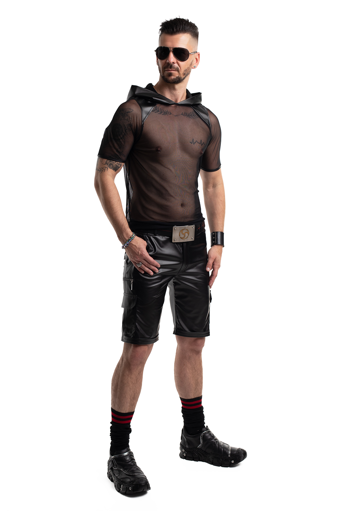 Una t-shirt realizzata in rete morbida al tatto, altamente elastica e trasparente che rivela delicatamente la muscolatura, i tatuaggi o i piercing. Il tessuto è estremamente confortevole sulla pelle e si adatta perfettamente al corpo. L'ampio cappuccio effetto bagnato è un dettaglio distintivo e distintivo che definisce l'intero design. Perfetta da abbinare agli shorts RMPaolo001.